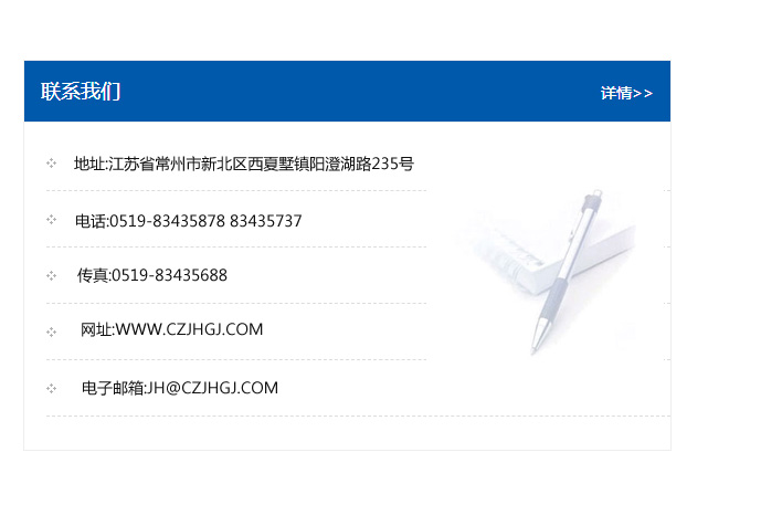 傳真:0519-83435688    郵編:213135    網(wǎng)址:WWW.czjhgj_com.xjmwsl.com    電子郵箱:JH@czjhgj_com.xjmwsl.com